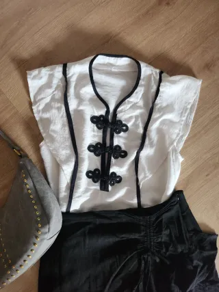Camiseta con un diseño inspirado en la moda asiática. Presenta un cuello mao y cierres de estilo oriental. - Detalle de ribetes negros. - Cierres de cordón negros Me costo 20e