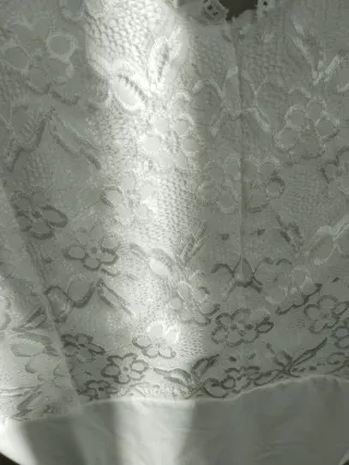 Blusa de mujer en color blanco, talla XL. Presenta un diseño con detalles de encaje en el cuello y en la parte frontal. - Mangas cortas. - Adornos de encaje. - Cintura elástica.