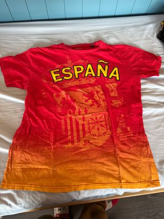 Camiseta con diseño inspirado en España. Presenta un degradado de color rojo a naranja. - Diseño gráfico de España. - Cuello redondo. - Manga corta.