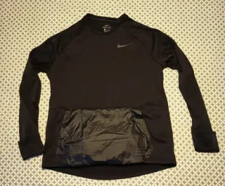 Camiseta deportiva Nike de manga larga con un diseño moderno y funcional. - Tejido Dri-FIT para una óptima transpiración. - Bolsillo frontal con acabado brillante y chubasquero en su interior (por si te pilla la lluvia). - Puños elásticos.