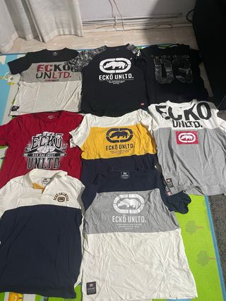 Lote de siete camisetas de la marca Ecko Unltd. Variedad de colores y diseños. - Tallas L y XL. - Diseños con el logo de Ecko. - Incluye camiseta tipo polo. Camietas usada y con marcas de uso. De ahi su precio economico. Tal y como se muestran en las fotos