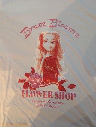 Camiseta blanca con estampado de la muñeca Jasmine de Bratz. - Diseño Flower Shop. - Estampado frontal con flores y texto. - Cuello redondo.