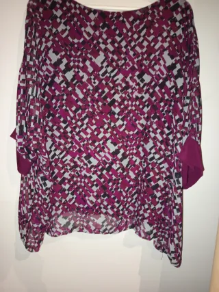 Camisola de señora con un estampado geométrico en tonos fucsia, morado y gris. - Diseño de manga 3/4. - Tejido ligero y fluido.