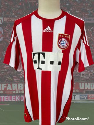 Camiseta de fútbol del Bayern de Múnich. Diseño a rayas rojas y blancas, talle XL, de la temporada 2009 2010 en excelente estado. Camiseta original de la epoca. - Escudo del club bordado. - Logo de Adidas. - Patrocinador T-Mobile.