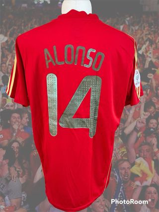 Camiseta de fútbol de la selección española con el dorsal 14 y el nombre ALONSO, de la temporada 2008, talle XL en excelente estado, camiseta de la epoca ! - Diseño con detalles dorados en las mangas. - Número y nombre con acabado metálico. - Parche de competición en la manga derecha.
