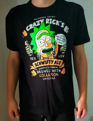 RICK & MORTY / Schwifty Ale Camiseta negra de manga corta. Color negro. 100% algodón. Diseño / serigrafía delante. Marca JHK. NUEVA, de almacén. Talla XL. Medidas aproximadas talla XL: 75 CM LARGO 57/58 CM ANCHO (SISA)