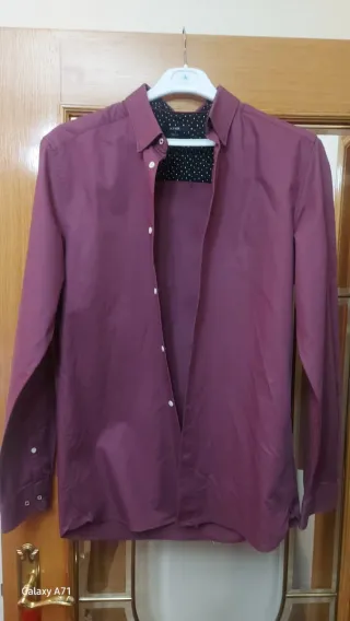 Camisa de vestir de manga larga en tono morado. Presenta un diseño clásico con cuello y puños. - Cuello con estampado de puntos. - Cierre de botones blancos. - Puños con doble botón. Marca Kiabi slim fit Talla L (41-42) Medidas: largo 74cm ancho 53 hombro15cm 65cm manga.