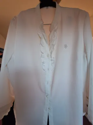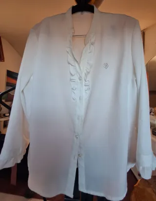 2xElegante blusa blanca de manga larga. T 48. MEDIDAS: 1 foto:ancho hombros 42cm/sisa 53/ largo 66/ manga 62. 4 foto: ancho hombros 44cm/ largo 70/ sisa 55/ manga 63 - Cuello con volantes. - Cierre de botones. - Pequeño bordado floral en el pecho. - Puños con volantes. Precio Lote de 2.