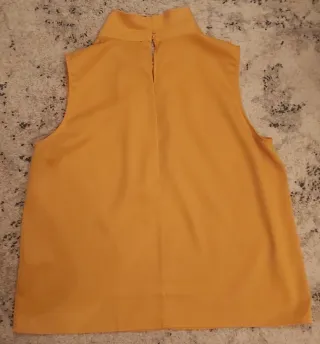 Elegante blusa sin mangas de color amarillo. Presenta un cuello alto con un detalle de fruncido y una abertura en la parte trasera. Colo amarillo yema huevo - Cuello alto con fruncido. - Abertura trasera con cierre. - Diseño sin mangas. Medidas: Sisa 59 cm Largo 63 cm Ancho parte baja 63 cm