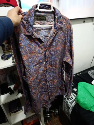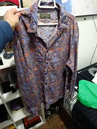 Camisa de manga larga con estampado de camuflaje. Dos bolsillos en el pecho con solapa y botón. Puños con botón y trabillas para recoger las mangas. Un poco entallada y con bajo redondeado. Tela fuerte, como vaquera. Medidas en las fotos. Indica talla XXXL, pero es más bien XL-XXL.