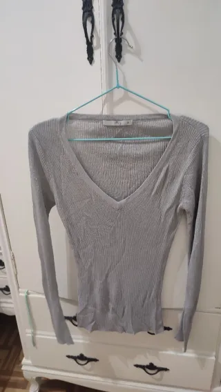 Camiseta de manga larga con un acabado metalizado que le da un toque brillante. Su diseño de canalé la hace muy favorecedora. - Cuello en pico. - Tejido elástico y cómodo.