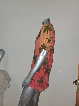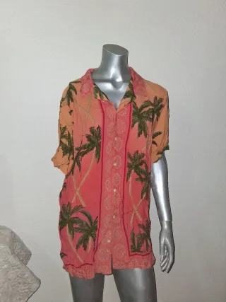 Camiseta de estilo hawaiano con un vibrante estampado de palmeras. Ideal para un look veraniego y relajado. - Talla: XL. - Material: 60 cms de sisa, 76 cms de largo. - Diseño con palmeras verdes sobre fondo naranja y rojo. - Cuello camisero. - Manga corta. - Cierre de botones. - Material: 100% Viscosa.