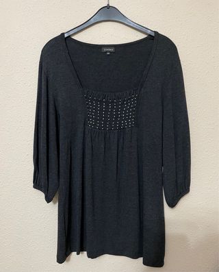 Camiseta larga de manga tres cuartos con detalle de pedrería. - Cuello cuadrado. - Adorno de pequeños brillantes en la zona del escote. - Mangas abullonadas. - Corte imperio con fruncido.