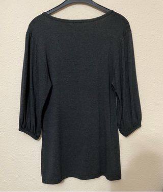 Camiseta de manga tres cuartos con detalle metálico en el escote. - Escote redondo con abertura. - Detalle de anilla dorada en la abertura. - Mangas tres cuartos. Camiseta de manga larga con un diseño original en el cuello. - Cuello redondo con detalle de anilla. - Mangas largas acampanadas. - Tejido suave y cómodo.
