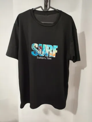 Preciosa Camiseta Surfera Hombre , Nueva sin Uso, Talla XL, Negra con estampado de Surf. - Diseño SURF con olas y surfista. - Texto Teahupo'o, Tahiti debajo del diseño.