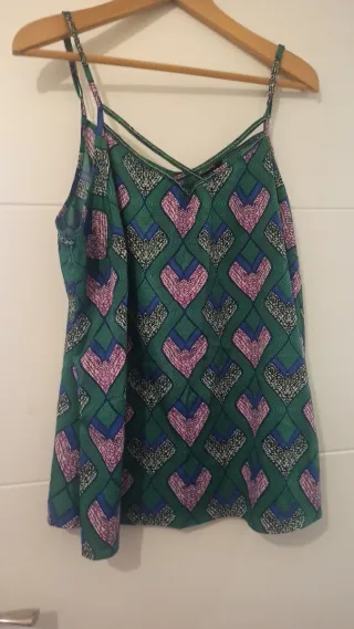 Camiseta de tirantes con un llamativo estampado tipo africano y cuentas en el escote. - Diseño con escote cruzado y tirita separada - Estampado geométrico con detalles en forma de corazón. - leve desperfecto en las cuentas del escote parte izquierda. Ver última foto. Se puede reparar