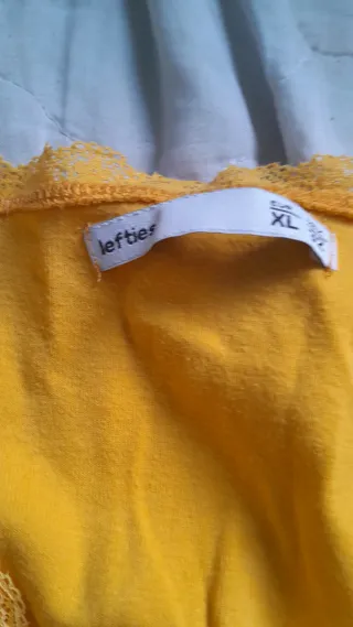 Camiseta de tirantes en color mostaza con detalles de encaje en el escote y el bajo. Tejido suave y ligero. Talla XL. Esta en perfecto estado