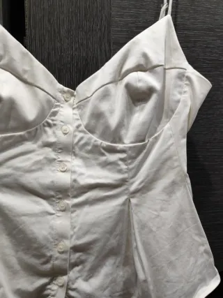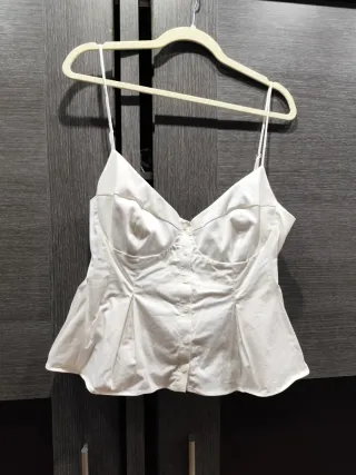 Elegante blusa peplum en color blanco. Un diseño favorecedor que realza la figura. - Corte peplum. - Detalle de botones frontales. - Tirantes finos. - Confeccionada en tejido de algodón.