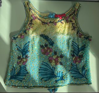 Elegante blusa sin mangas con un diseño brillante y detallado. Talla XL - Bordados florales y de hojas. - Lentejuelas brillantes. - Degradado de color amarillo a turquesa.