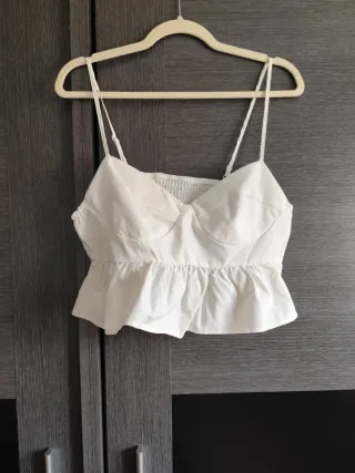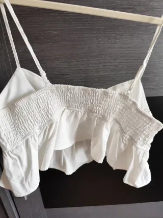 Blusa estilo peplum en color blanco. Presenta un diseño con tirantes finos y un detalle fruncido en la parte superior del busto. - Diseño con volantes en el bajo. - Tirantes ajustables.