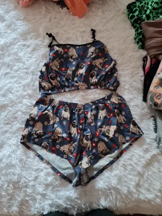Conjunto de 3 piezas de pijama con estampado de perros pug y corazones. Está totalmente nuevo. Es talla XL pero es válido para L también - Camiseta de tirantes. - Pantalón corto. - Tejido suave y cómodo.