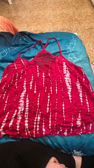 Camiseta de tirantes con un tejido ligero que imita al lino. Color teja, elástica y corte evasé. Talla 46/48 de Kiabi, amplia y cómoda. Mide aprox 73 cm de largo y 68 de sisa. Está muy poco usada.