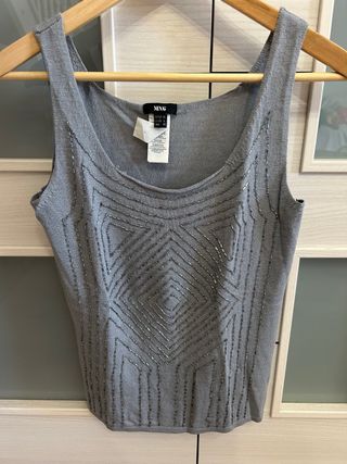 Top de punto gris de Mango con un diseño geométrico adornado con pedrería plateada. - Escote redondo. - Tirantes anchos. - Diseño de rombos y líneas.