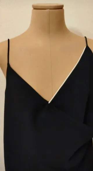 Elegante top negro con tirantes finos,talla poco.PRECIO NO NEGOCIABLE. Largo 62 cm. Sisa 51 cm - Diseño con escote cruzado. - Detalle de ribete blanco en el escote. - Tejido ligero y fluido.