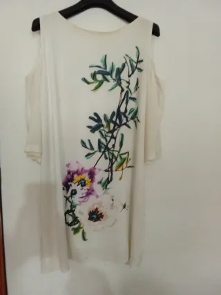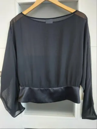 Elegante blusa semitransparente de gasa y raso, de la firma Síntesis, en talla 42.39,99 - Diseño con mangas murciélago. - Fajín que aporta un toque sofisticado. - Tejido ligero y fluido. - Con camiseta de tirantes para poner debajo. - Cremallera en el lateral para que la cintura quede ajustada. Medidas cintura (zona de raso): 41cm la parte superior y la inferior 47cm. Hago envíos, también se puede recoger en calle Jaime el Conquistador (28045, cerca de los metros Legazpi y Delicias).