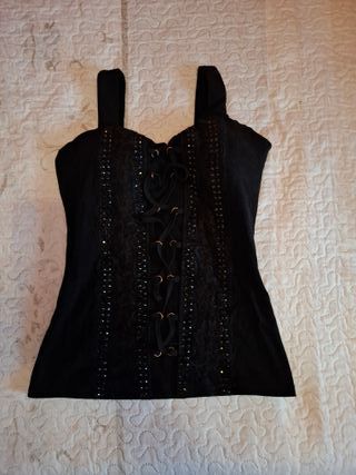 Camiseta de tirantes con diseño de corsé. Talla en etiqueta L-XL, pero en realidad es una S-M. - Detalle de encaje en el centro. - Cierre de cordones con ojales metálicos. - Adorno de pedrería a los lados.
