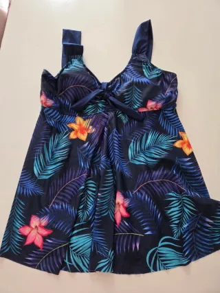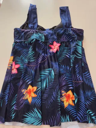 Dos bañadores con un vibrante estampado tropical de hojas y flores. Tiene dos partes de arriba y 1 de abajo que esa esta sin estrenar. Talla 2xl viene siendo 46-48 recoge muy bien el pecho y barriga - Diseño con tirantes y lazo en el escote. - Falda integrada para mayor comodidad. - Tejido con caída fluida. Zara hm breshka fiesta boda comunión camiseta jeans chica moda joven corte inglés massimo duti playa verano camisetas Navidad otoño regalo verde azul corte inglés massimo duti biquini