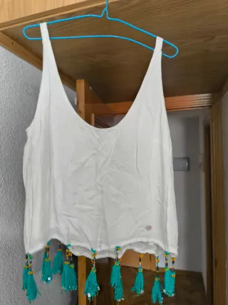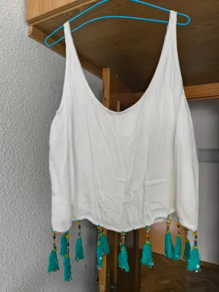 Top blanco de la marca Pepita Pérez blanco con flecos adornados con cuentas y lentejuelas en la parte inferior. De tirantes. Talla XL