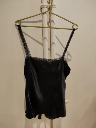 Top de tirantes con un delicado encaje en el escote y los tirantes. El tejido es de seda, lo que le da un acabado brillante y elegante. - Tirantes finos con detalle de encaje. - Escote adornado con encaje. - Tejido satinado.