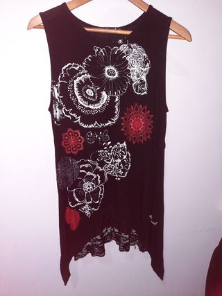 Camiseta tirantes talla XL desigual: es negra por detrás y por delante flor en beige, rojas, marrón.