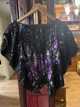 Blusa lentejuelas negra con motivos morados y plata. Talla 42. Como se ve en la ultima foto, está un poco descosida por uno de los hombros.