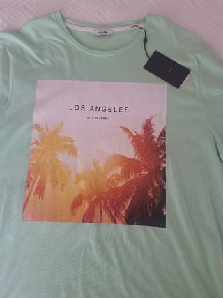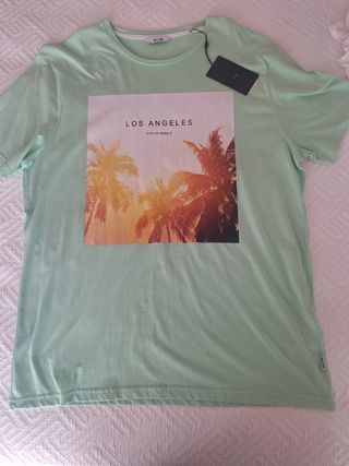 Preciosa camiseta de hombre, nueva con etiqueta. Luce un diseño de palmeras de Los Ángeles. - Talla: XL - Es de color verde claro. - Tiene un corte clásico.