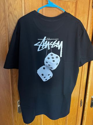 Camiseta negra de Stüssy con un diseño gráfico de dados colgando. - Talla XL. - Estampado frontal.