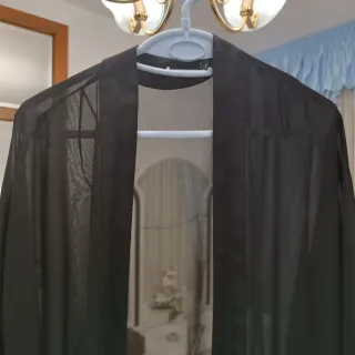 Blusón de gasa con un diseño elegante y moderno. - Tejido ligero y vaporoso. - Detalle de flecos en el bajo. - Corte amplio y cómodo.como guarda polvos encima del vestido . Usado en un evento. Largo total 108 cm