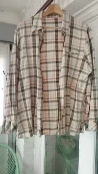 Camisa de cuadros con un diseño moderno y versátil. Talla XL..monisima - Patrón de cuadros en tonos tostados y salmón. - Cuello camisero clásico. - Manga larga.