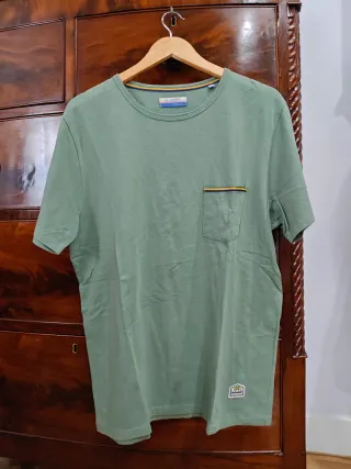 Camiseta de manga corta de color verde de la marca El Ganso. - Cuello redondo. - Bolsillo en el pecho con detalle de ribete multicolor. - Pequeño parche con diseño de arcoíris en la parte inferior.