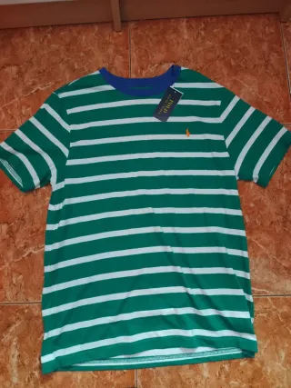 Camiseta de manga corta con un diseño de rayas verdes y blancas. - Cuello redondo. - Logo del caballo bordado en el pecho. NO NEGOCIABLE 🏷️Marca: Polo Ralph Lauren 💎Calidad: 10/10 🛍️Precio tienda: 90€ ❌Desperfectos: Ninguno 📏Talla Recomendada: XL ( 18-20 años) 🚚Envios Rápidos: 12/24 horas. 📦Empaquetado Profesional: cajas/bolsas selladas 💬Atención: Respondo rápido, ino dudes en preguntar!