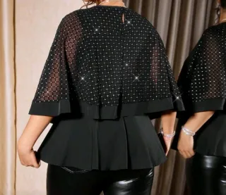 Bonita blusa con detalles brillantes, ideal para realzar tu estilo. - Diseño con manga corta tipo capa. - Tejido superior con estampado de rombos y pedrería. - Capa inferior con vuelo. - Cuello redondo. Superbonita nueva a estrenar para tallas 50 52 54