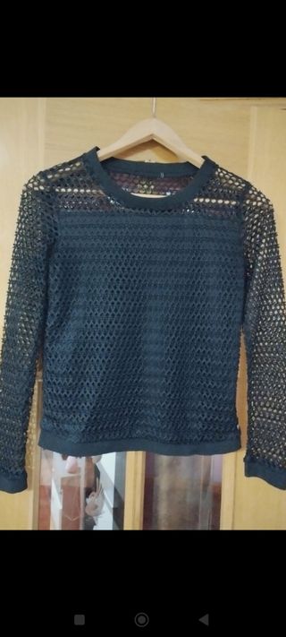 Camiseta de manga larga con un diseño de red y transparencias. La parte delantera y trasera tienen un tejido con líneas horizontales que crean un efecto texturizado. Medidas: 50cm de largo, 42cm de cintura, 43cm de hombro a hombro y 43cm de axila a axila. - Diseño de red en mangas y hombros. - Tejido con líneas horizontales en el cuerpo.