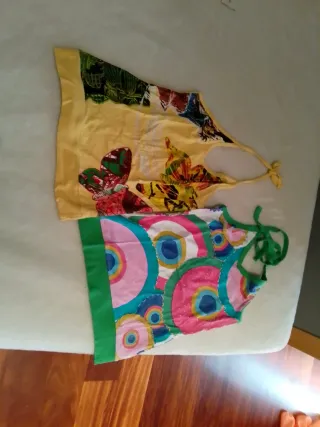 Conjunto de dos tops de la marca Desigual con diseños vibrantes. - Top amarillo con estampado de mariposas. - Top multicolor con estampado circular. - Tirantes para atar al cuello.