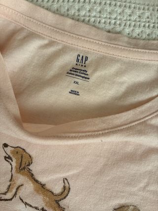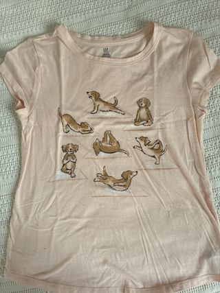 Camiseta de manga corta para niña con un divertido estampado de perritos haciendo yoga. - Diseño original de Gap. - Estampado de perros en diferentes posturas de yoga. - Color rosa pálido. - Es la talla xxl de niña de Gap