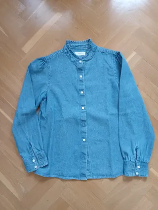 Camisa vaquera de Mango Teens con cuello alto y detalle fruncido. Manga larga abullonada con puño. Impecable - Cierre de botones. - Puños con botones. - Cuello con volante.