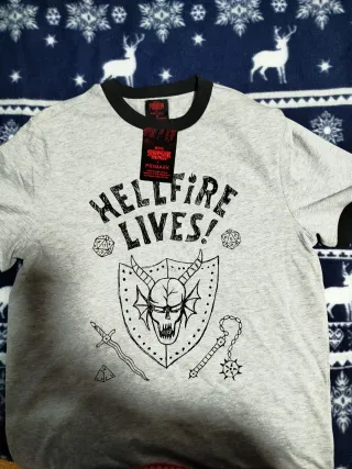 Camiseta gris de manga corta con diseño de Stranger Things., tengo talla XS, talla S , talla M y talla L. - Estampado frontal Hellfire Lives!. - Cuello y mangas con ribete en contraste. - Licencia oficial de Netflix.