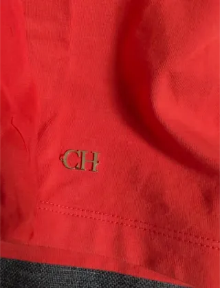 Camiseta de manga corta con un diseño elegante y un lazo decorativo en el cuello.Preciosa camiseta manga corta talla XS cómoda y elegante de la marca Carolina Herrera color coral lazo al cuello se puede llevar suelto o tal cuál veis, las fotografías son parte de la descripción - Cuello con lazada. - Detalle de logo bordado en la parte inferior.