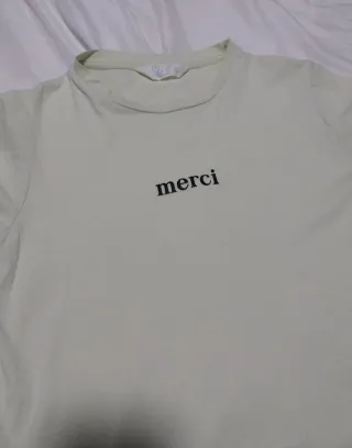 Camiseta de manga corta de color verde menta, con un diseño en medio que pone "Merci", "Gracias" en francés. Talla 2XS 💚 Está en buen estado, como se puede ver en las fotos, solo está un poco arrugada y la etiqueta un poco amarilla del tiempo guardado. Fast shipping/Envío rápido 💨🥾 Packaged with care/ Empaquetado con cariño 📦🩷 📩 Si tienes alguna duda o quieres ver más fotos, no dudes en escribirme por privado 🤭 Tags/Etiquetas: Camiseta Ropa Verde menta Verano Manga corta Hashtags: #mangacorta #camiseta #camisetamujer #primark #primarkfashion #primarkfemme #verdementa #francia #france #francais