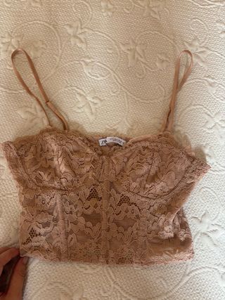 Corsé tipo lencero de Zara con un delicado diseño de encaje. - Tejido de encaje floral. - Tirantes finos ajustables. - Corte estilo bustier.